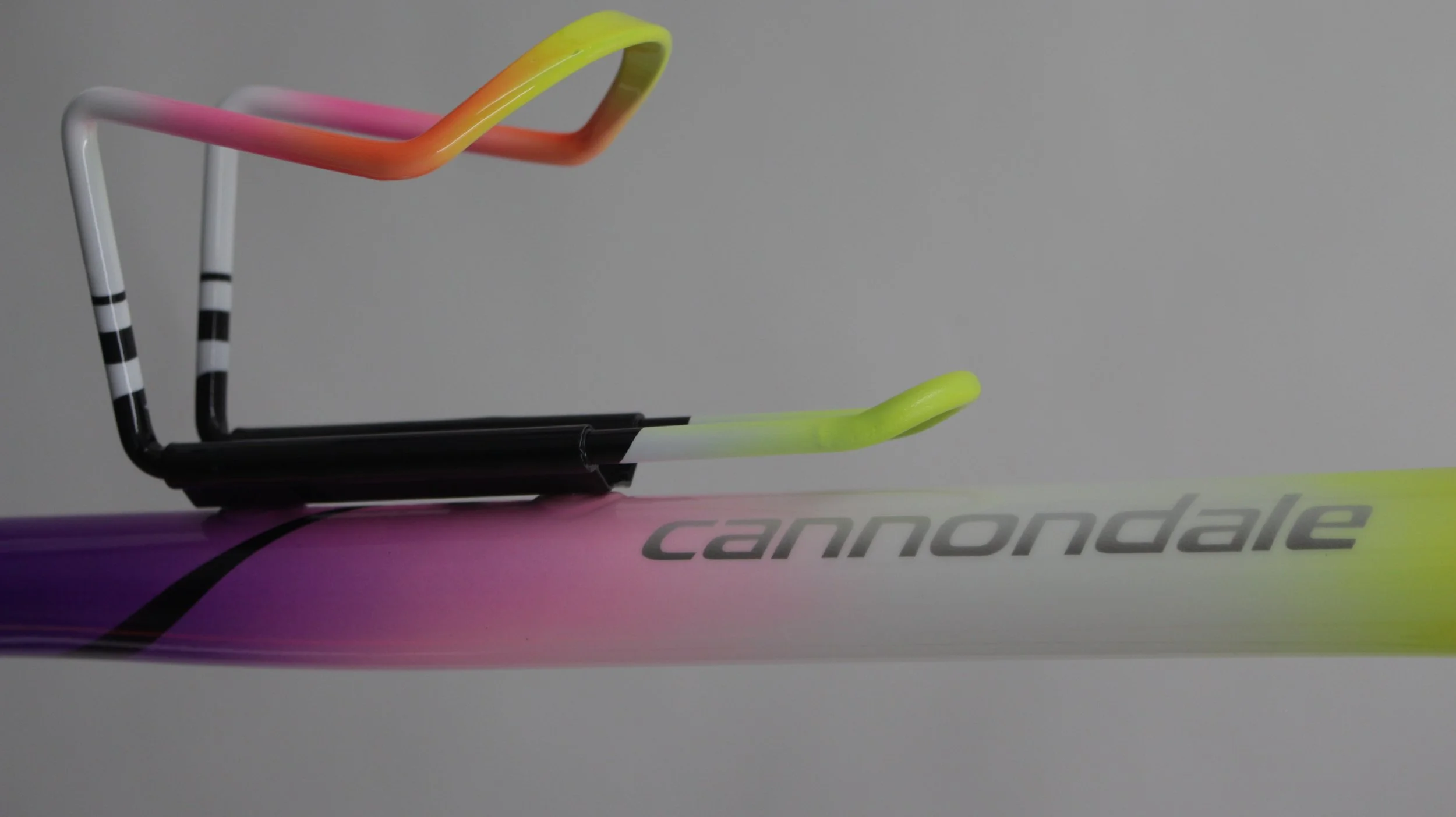 This Customer wanted something wild with allot of color and fade. The offset of Black and White flipping from left fork to right side of the frame was a cool effect. The Cannondale logos was painted with nice silver shadow.