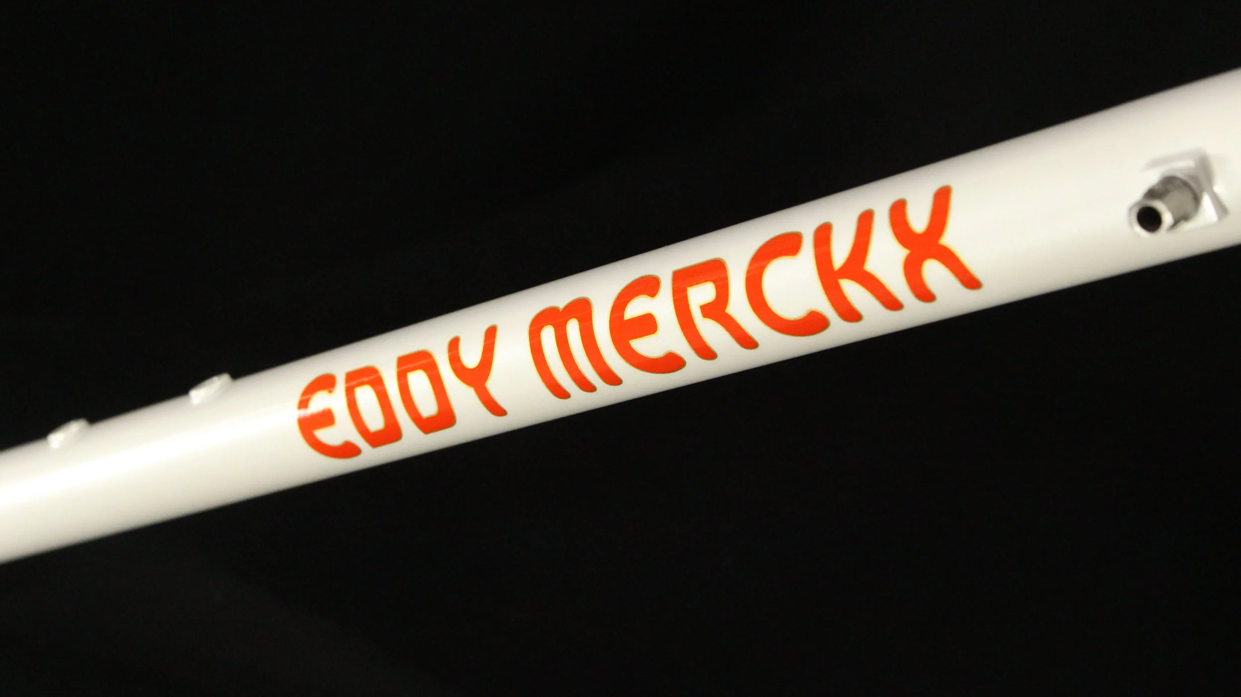 Eddy Merckx “Grand Prix” in a Pearl White. Red & Gold logos with hand painted Red details.